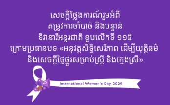 សេចក្តីថ្លែងការណ៍រួមអំពី តម្រូវការចាំបាច់ និងបន្ទាន់ ទិវានារីអន្តរជាតិ ខួបលើកទី ១១៥ ក្រោមប្រធានបទ «អនុវត្តសិទ្ធិសេរីភាព ដើម្បីយុត្តិធម៌ និងសេចក្តីថ្លៃថ្នូរសម្រាប់ស្រ្តី និងក្មេងស្រី» Read More