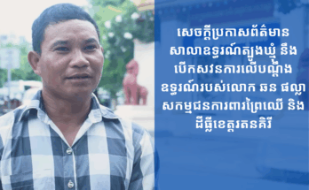 សេចក្តីប្រកាសព័ត៌មាន សាលាឧទ្ធរណ៍ខេត្តត្បូងឃ្មុំ នឹងបើកសវនការលើបណ្តឹងឧទ្ធរណ៍របស់លោក ឆន ផល្លា សកម្មជនការពារព្រៃឈើ និងដីធ្លីខេត្តរតនគិរី