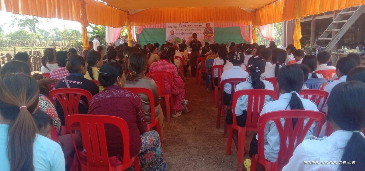 កាលពីនៅថ្ងៃទី០៨ ខែមីនា ឆ្នាំ២០២៦ នេះ សហគមន៍កែលម្អជីវភាពបរិបូណ៌ បានរៀបចំទិវានារីអន្តរជាតិ ខួបលើកទី១១៥ ឆ្នាំ២០២៦ ក្រោមប្រធានបទ «គាំពារសង្គមឆ្លើយតបវិបត្តិសម្រាប់ស្រ្តីវិស័យកសិ-ស្បៀងអាហារ» ដែលធ្វើឡើងនៅក្នុងភូមិបរិបូណ៌ ឃុំភ្នំត្បែងពីរ ស្រុកគូលែន ខេត្តព្រះវិហារ ដែលមានអ្នកចូលរួមពីអង្គការសង្គមស៊ីវិល សហគមន៍ ប្រជាពលរដ្ឋមកពីភូមិបរិបូណ៌ ភូមិស្រឡៃ ភូមិឈូក ឃុំភ្នំត្បែងពីរ សិស្សានុសិស្សនៃអនុវិទ្យាល័យបរិបូណ៌ អាជ្ញាធរឃុំ-ប៉ុស្តិ៍ និងមេភូមិទាំងបីភូមិ សរុបចំនួន១៥៧នាក់ ក្នុងនោះមានស្ត្រីចំនួន១០២នាក់។ ទិវានេះធ្វើឡើងក្នុងគោលបំណងលើកកម្ពស់ការទទួលស្គាល់សិទ្ធិ និងសេចក្តីថ្លៃថ្នូររបស់ស្រ្តីជនបទ ជំរុញប្រព័ន្ធគាំពារសង្គមដែលមានបរិយាបន្ន និងឆ្លើយតបនឹងវិបត្តិ ពង្រឹងសំឡេង និងសិទ្ធិអំណាចស្រ្តីក្នុងការចូលរួមធ្វើសេចក្តីសម្រេចចិត្ត និងលើកកម្ពស់ការយល់ដឹងរបស់ប្រជាពលរដ្ឋពីសិទ្ធិស្រ្តី និងសារៈសំខាន់នៃការចូលរួមរបស់ស្រ្តី ហើយគាំពារដល់ស្រ្តីដើម្បីចូលរួមក្នុងកិច្ចការអភិវឌ្ឍន៍សហគមន៍។