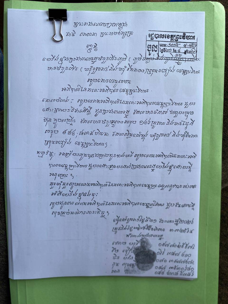 លោក យ៉ុង គឹមហឿង នាយករដ្ឋបាលសាលាខេត្តព្រះវិហារ បានចេញមកទទួលយកញត្តិពលរដ្ឋ និងប្រាប់ពលរដ្ឋថា គាត់នឹងយកញត្តិនេះដាក់ជូនអភិបាលខេត្តដើម្បីសម្រេចលើសំណើរបស់ប្រជាពលរដ្ឋ។