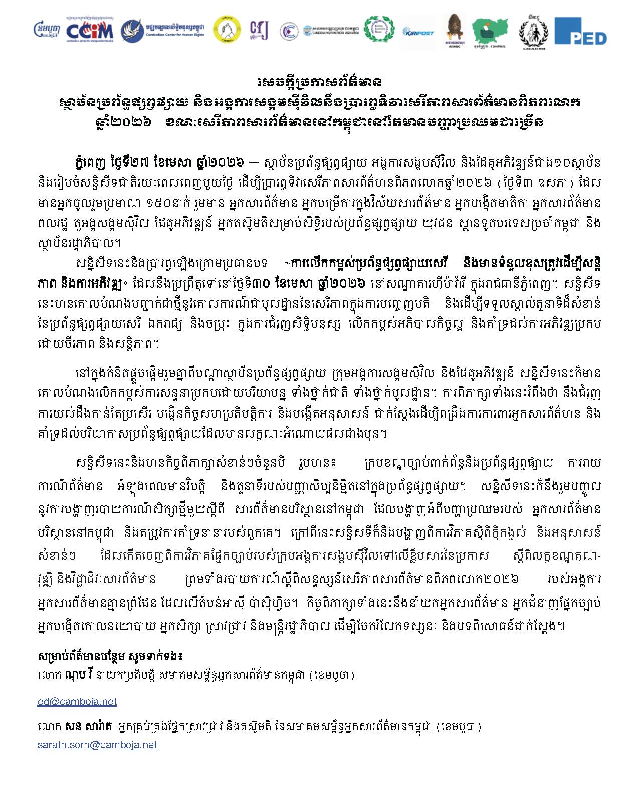 ភ្នំពេញ ថ្ងៃទី២៧ ខែមេសា ឆ្នាំ២០២៦ — ស្ថាប័នប្រព័ន្ធផ្សព្វផ្សាយ អង្គការសង្គមស៊ីវិល និងដៃគូអភិវឌ្ឍន៍ជាង១០ស្ថាប័ន នឹងរៀបចំសន្និសីទជាតិរយៈពេលពេញមួយថ្ងៃ ដើម្បីប្រារព្ធទិវាសេរីភាពសារព័ត៌មានពិភពលោកឆ្នាំ២០២៦ (ថ្ងៃទី៣ ឧសភា) ដែល មានអ្នកចូលរួមប្រមាណ ១៥០នាក់ រួមមាន អ្នកសារព័ត៌មាន អ្នកបម្រើការក្នុងវិស័យសារព័ត៌មាន អ្នកបង្កើតមាតិកា អ្នកសារព័ត៌មាន ពលរដ្ឋ តួអង្គសង្គមស៊ីវិល ដៃគូអភិវឌ្ឍន៍ អ្នកតស៊ូមតិសម្រាប់សិទ្ធិរបស់ប្រព័ន្ធផ្សព្វផ្សាយ យុវជន ស្ថានទូតបរទេសប្រចាំកម្ពុជា និង ស្ថាប័នរដ្ឋាភិបាល។